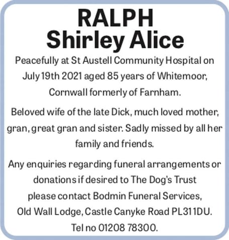 Any enquiries regarding funeral arrangements or donations if desired to The Dog’s Trust please contact Bodmin Funeral Services, Old Wall Lodge, Castle Canyke Road PL31 1DU. Telephone number: 01208 78300.